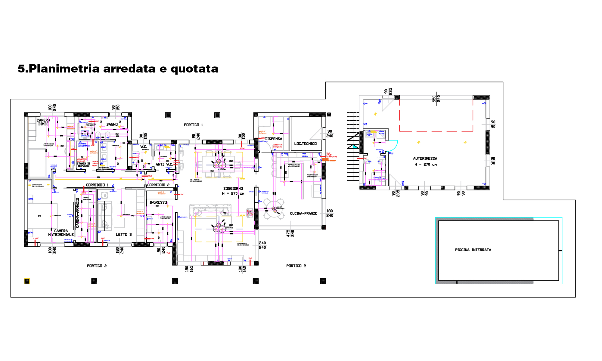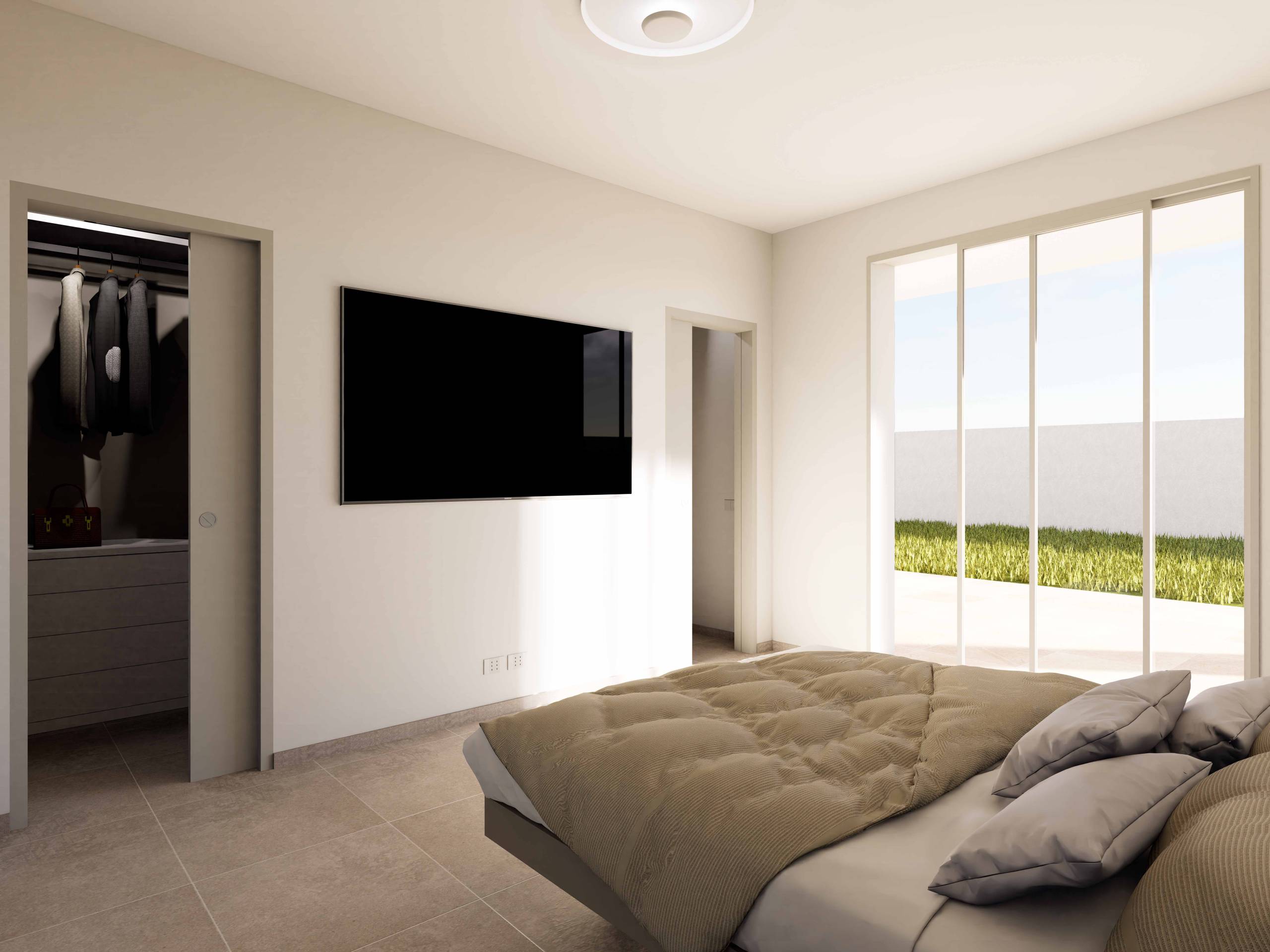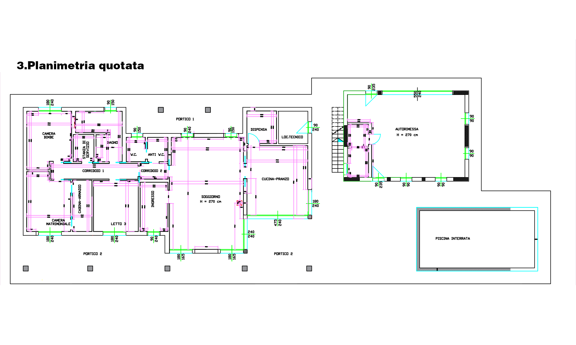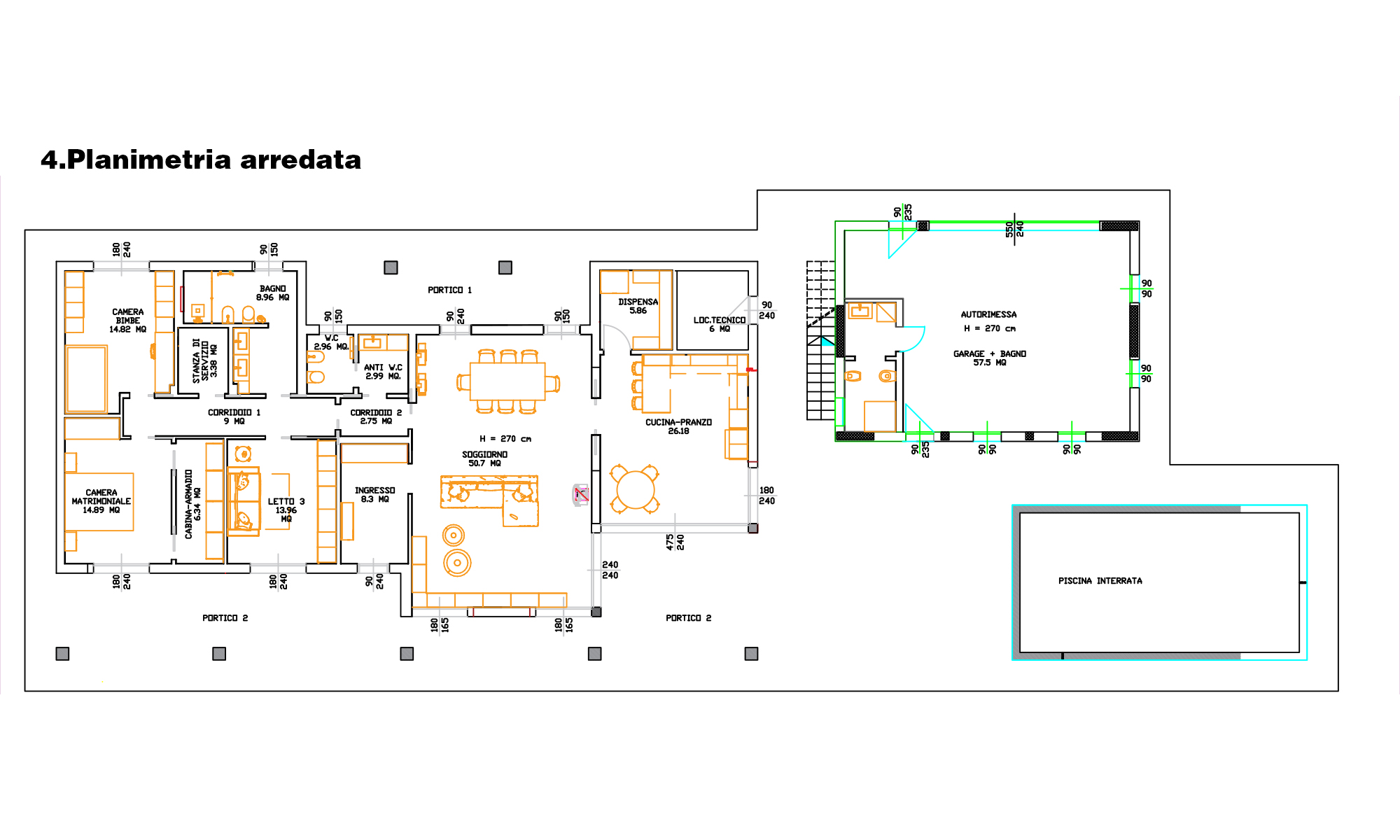 Questa Villa si sviluppa su un unico piano, ed è composta da 3 camere da letto di cui quella padronale con cabina armadio, due bagni, una zona lavanderia, un soggiorno molto grande, una cucina con dispensa, ed infine il locale tecnico annesso all’abitazione. Separato dalla casa troviamo l’autorimessa con annesso bagno di servizio.
