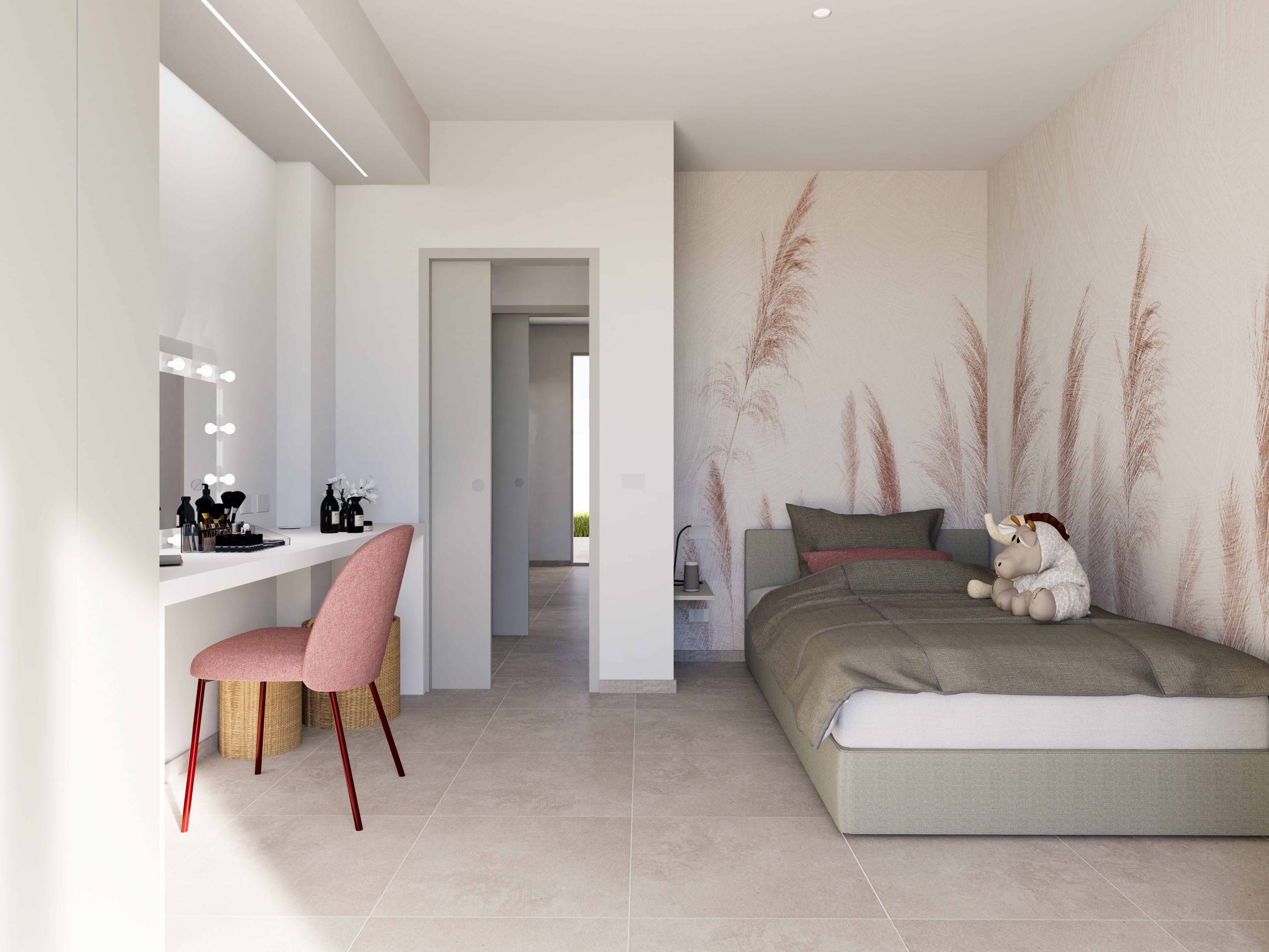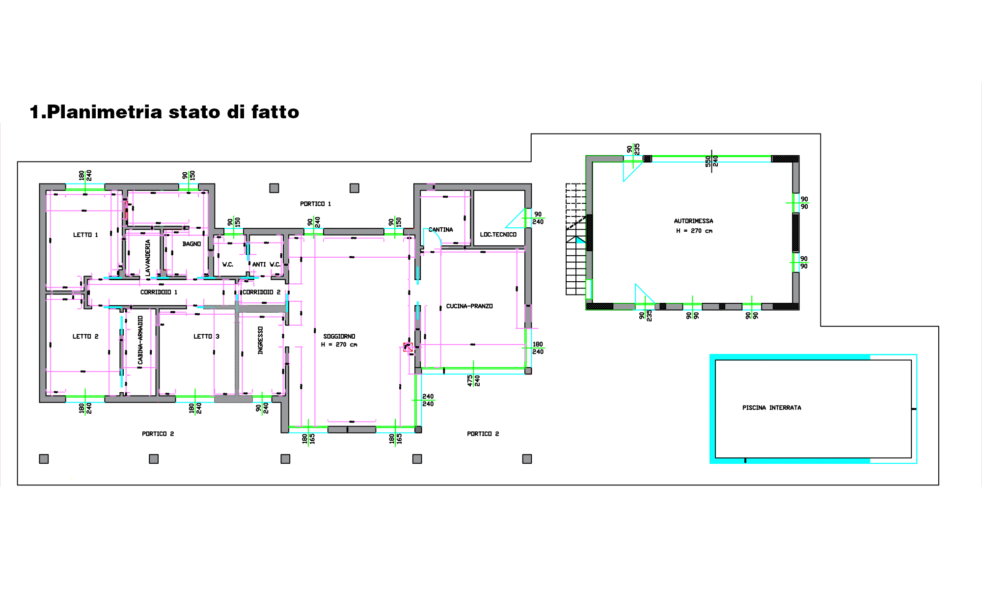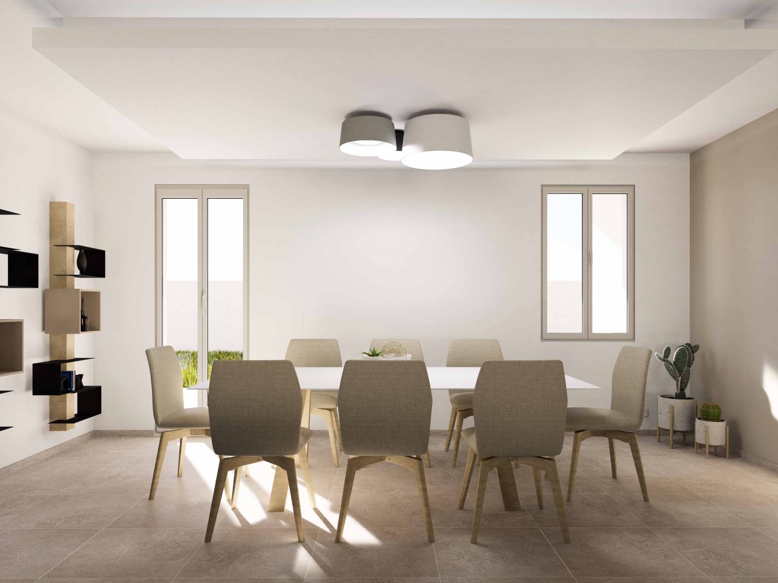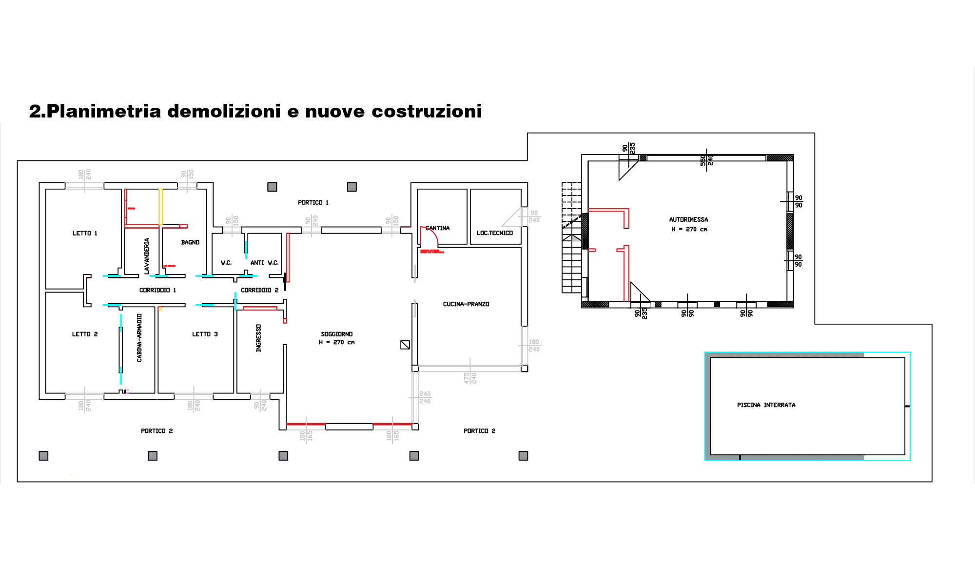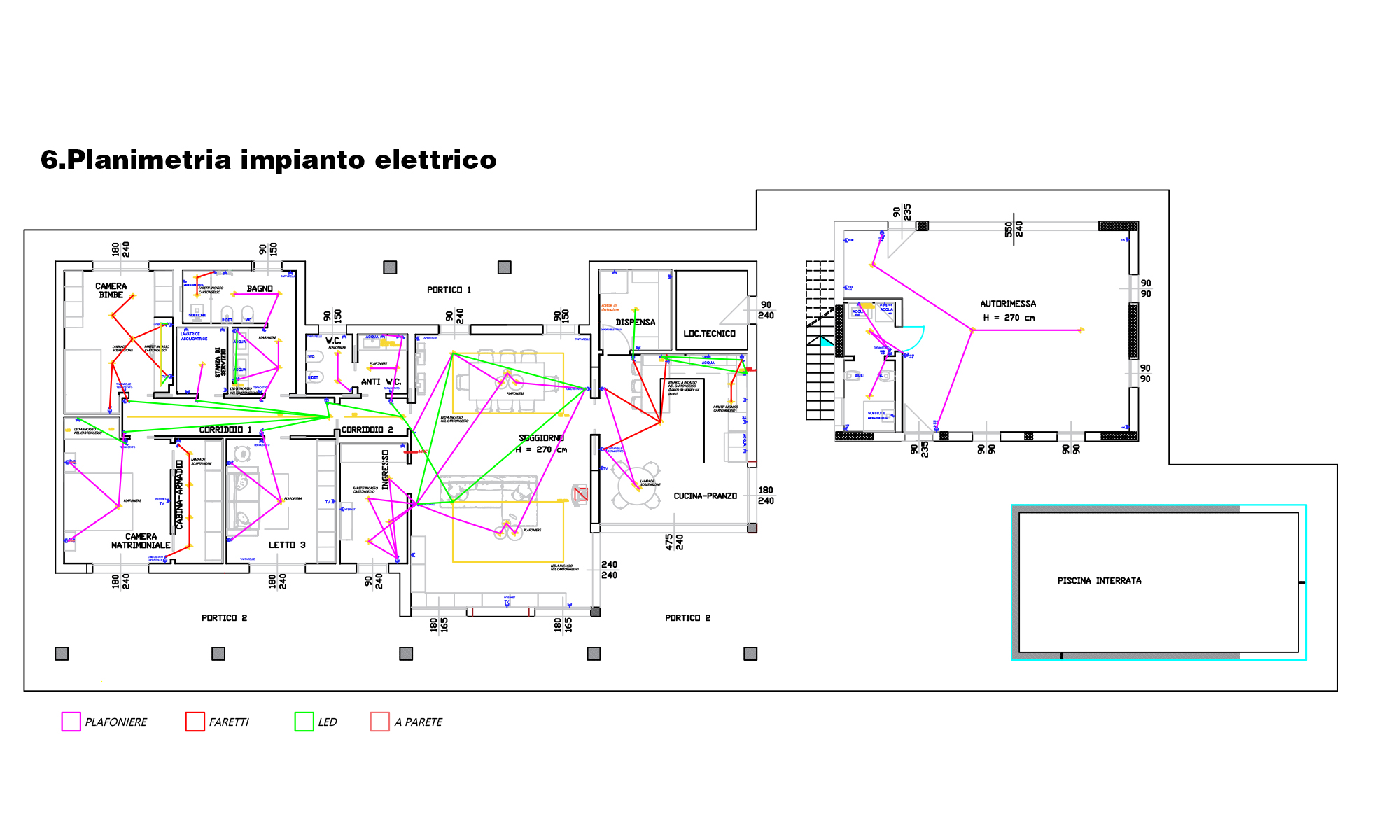 Questa Villa si sviluppa su un unico piano, ed è composta da 3 camere da letto di cui quella padronale con cabina armadio, due bagni, una zona lavanderia, un soggiorno molto grande, una cucina con dispensa, ed infine il locale tecnico annesso all’abitazione. Separato dalla casa troviamo l’autorimessa con annesso bagno di servizio.