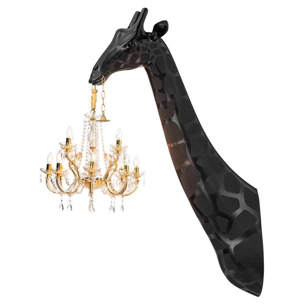 “Giraffe in Love” è la nuova creazione nata dalla collaborazione tra l’artista/designer Marcantonio e Qeeboo. Si trattai di un collo da giraffa che sorregge un elegante lampadario in stile Maria Teresa. Questa scultura simboleggia l’ironia e la leggerezza dell’amore: la giraffa è innamorata senza esserne ancora consapevole, poiché il suo cuore è lontano dalla testa, vivendo l’amore in modo spensierato.